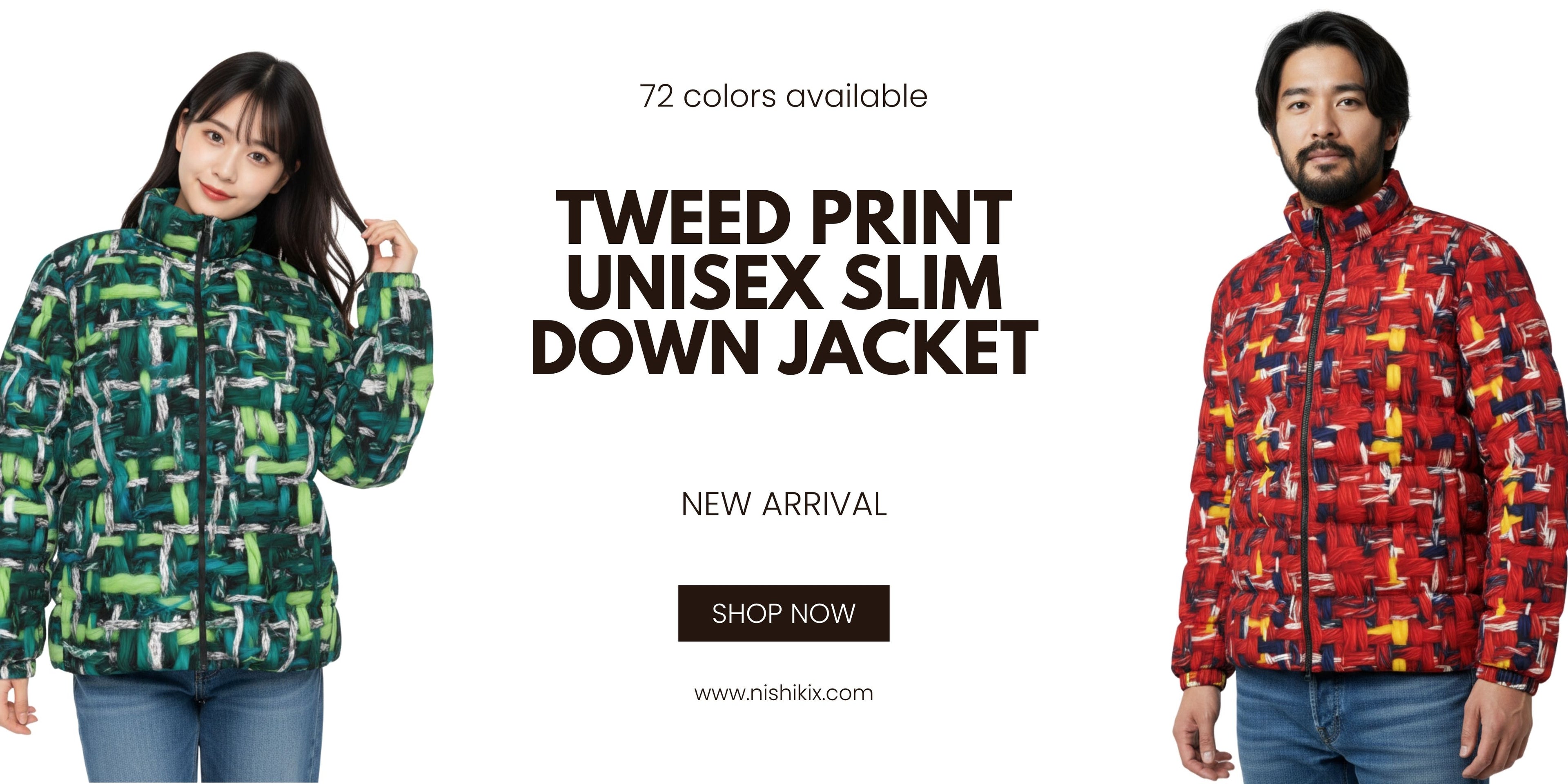 001 NISHIKIx Tweed Print Unisex Stand Collar Slim Down Jacket - White